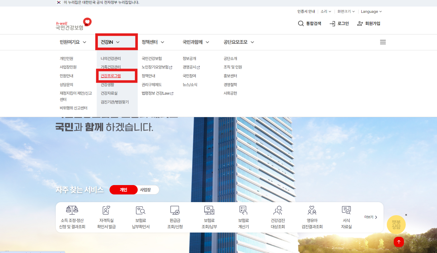 2. 상단 '건강 IN' > 건강프로그램 > 건강생활실천지원금제 클릭