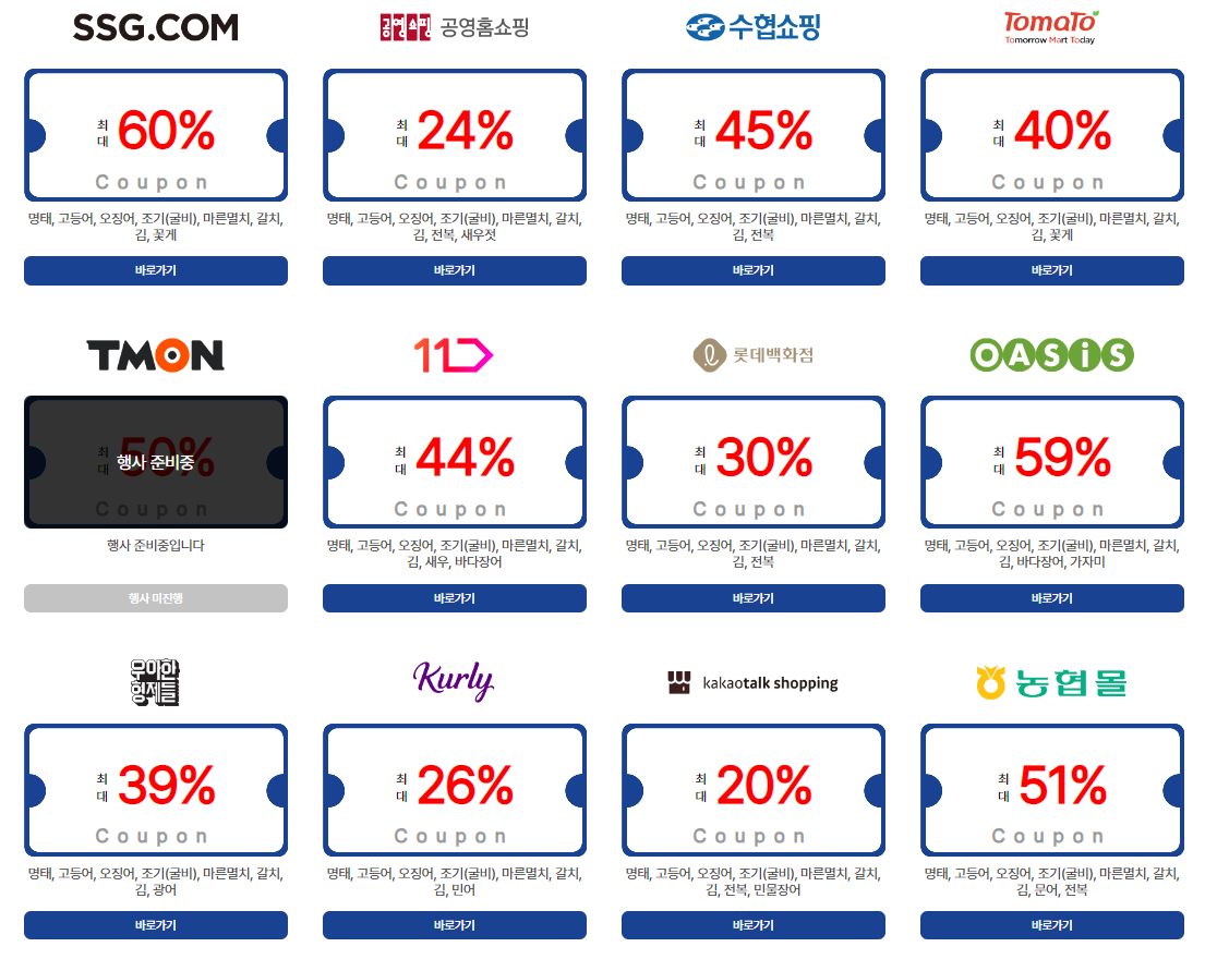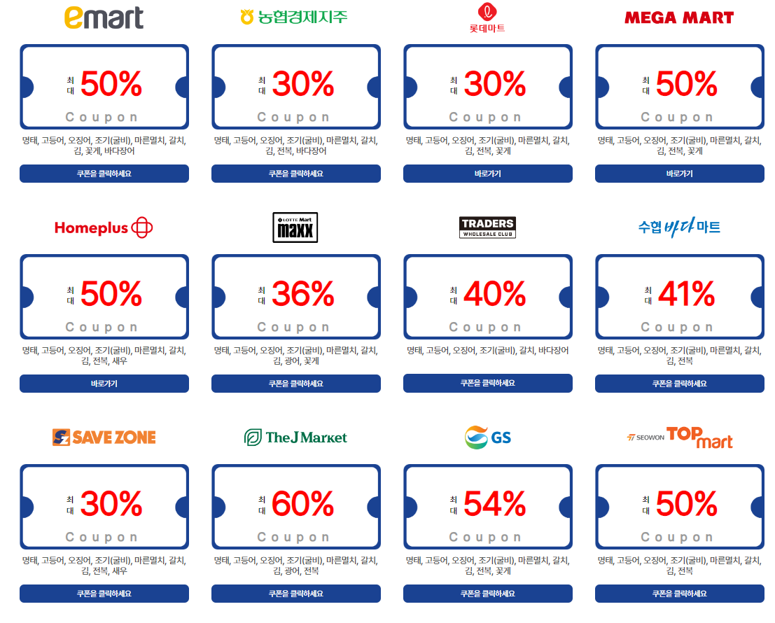 마트와 온라인 쇼핑몰마다 할인 적용 어종이 조금씩 차이가 있으니 확인하시고 쿠폰 받으시면 좋겠습니다.