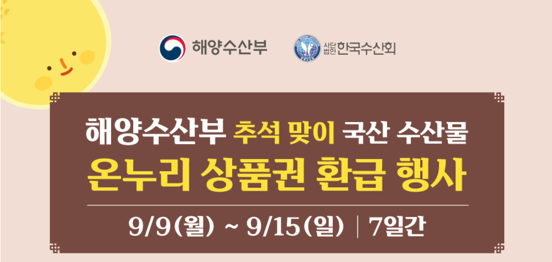 9월 15일까지 행사기간이니긴 하나 예산 소진 시 조기종료되니 놓치지 마시고 싱싱한 해산물 할인받으시길 바랍니다.