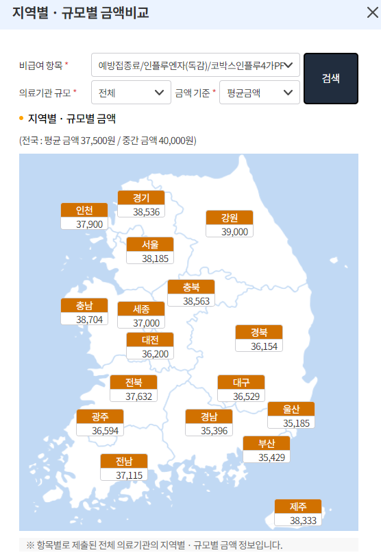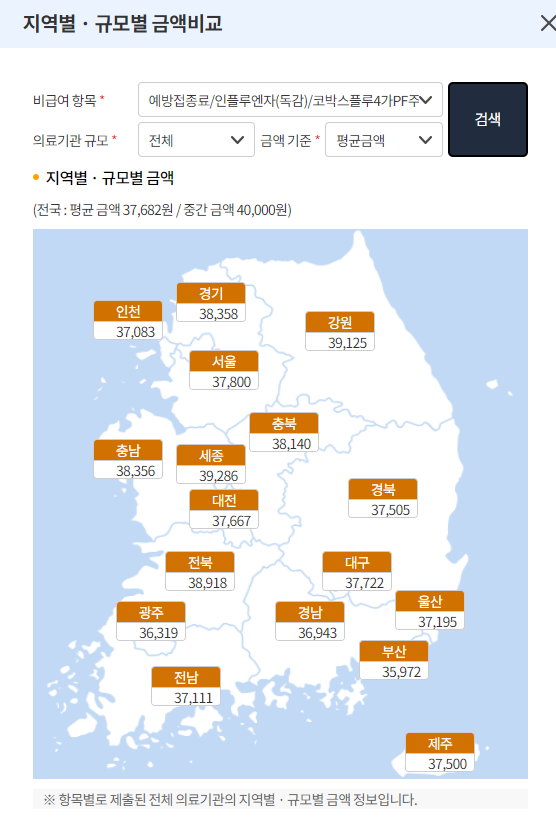 독감(인플루엔자) 예방 접종 가격은 전국적으로 평균 37,500원 정도입니다.