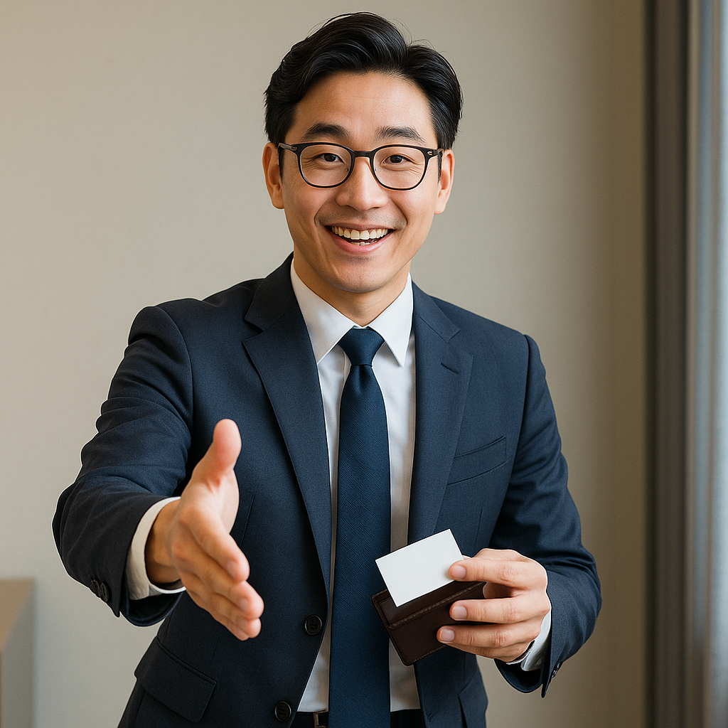 💡 명함을 앉은자리에서 무심코 건네거나, 한 손으로 툭 주는 행동은 신뢰를 깎는 실수입니다.