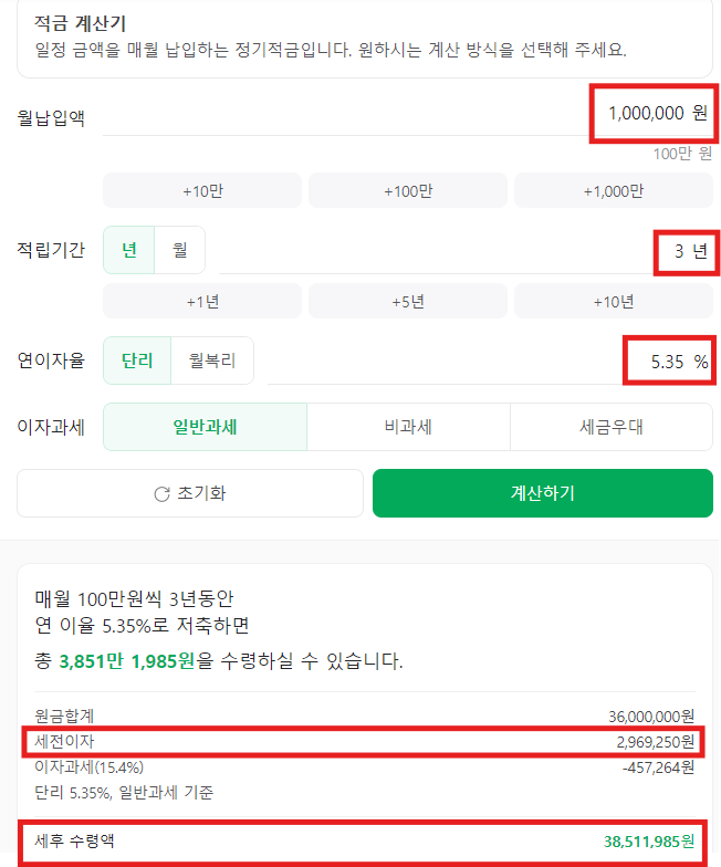 월 100만 원씩 36개월(3년) 만기 시 금리 5.35% 적용되는 금액은 38,511,985원입니다.
