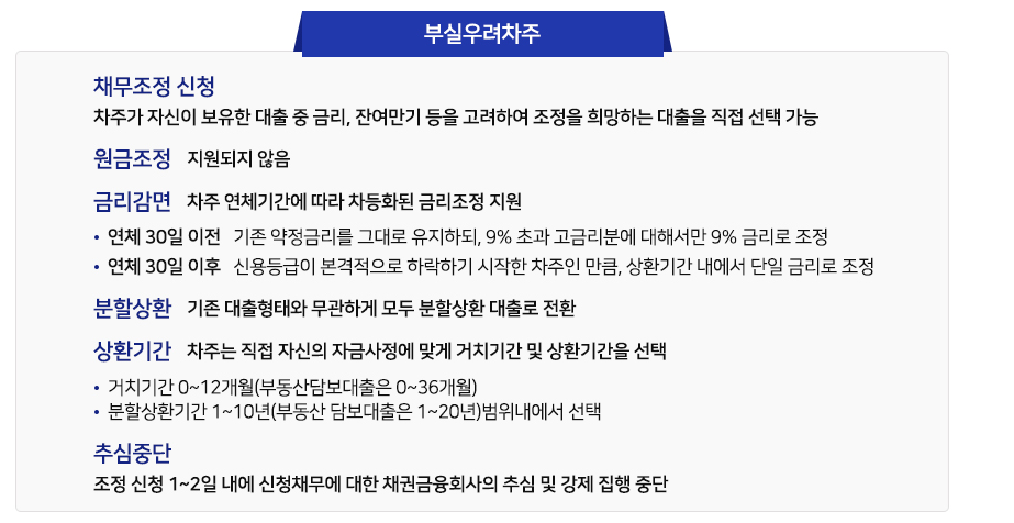 - 신용평점 하위차주 또는 고의성 없이 상당기간 연체가 발생한 차주 등