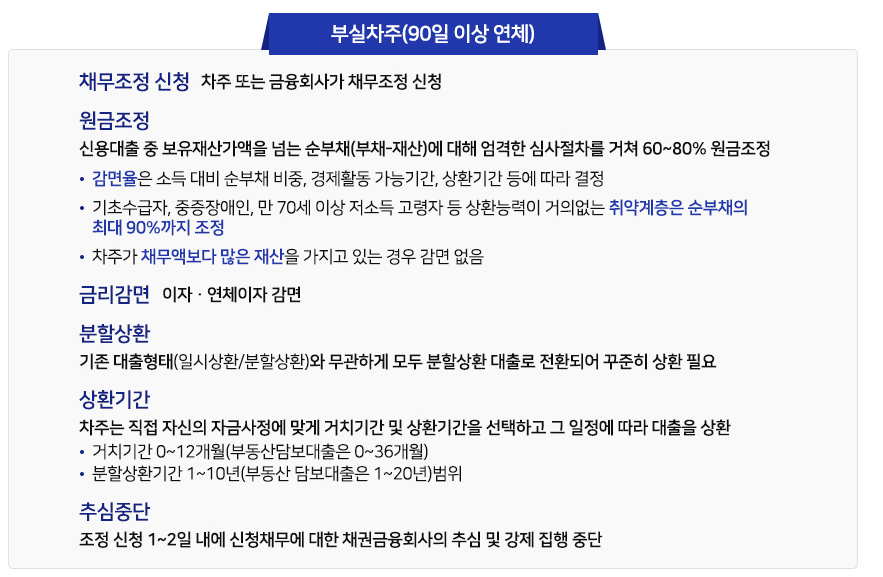 - 기초수급자, 중증장애인, 만 70세 이상 저소득 고령자 등 상환능력이 거의 없는 취약계층은 순부채의 최대 90%까지 조정