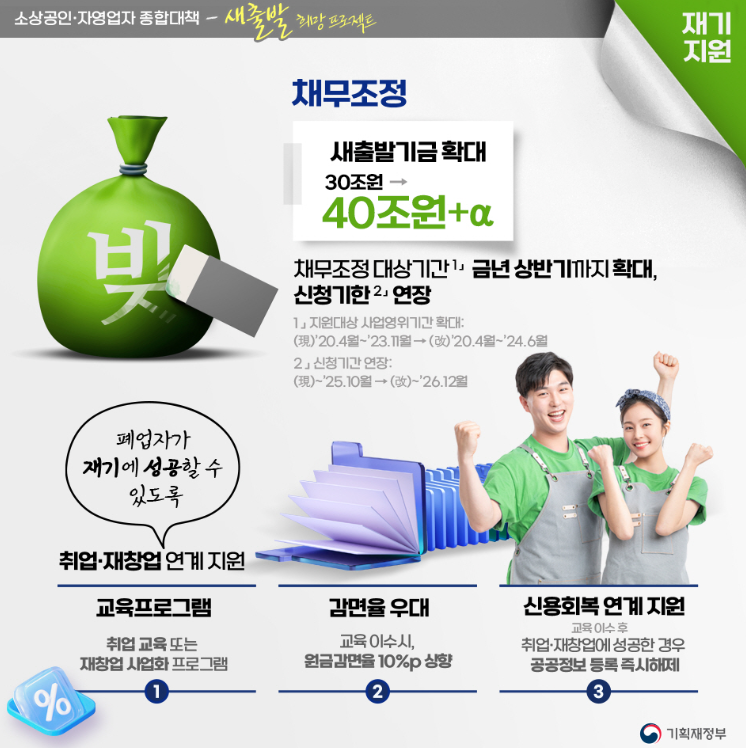 내용 - 채무조정 대상 및 신청기한 연장: 2020년 4월부터 2024년 6월까지 사업을 영위한 소상공인은 2026년 12월까지 채무조정 신청 가능. - 채무조정 프로그램 강화: 더 많은 소상공인이 혜택을 받을 수 있도록 프로그램 확대.