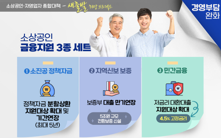고금리 대출 전환 내용 - 7% 이상의 고금리 민간대출을 저금리 대출로 전환. - 신용점수 기준 완화로 더 많은 소상공인이 혜택을 받을 수 있도록 함. - 사업자대출 외에 사업 용도의 가계대출까지 포함하여 대출 전환 가능.