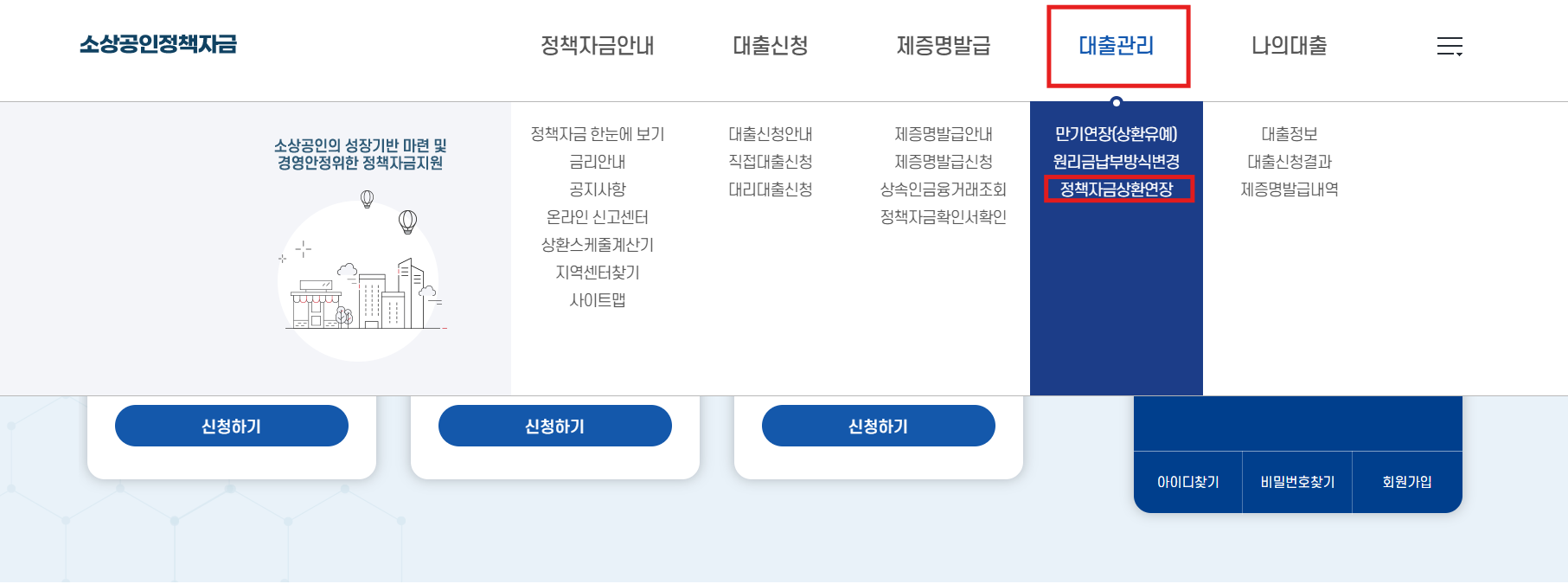 - 소상공인정책자금 누리집 회원가입 > 대출관리 > 정책자금상환연장