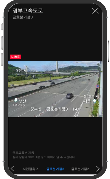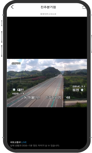 실시간으로 확인되는 교통상황은 실제상황과 30초 ~ 1분 정도 차이가 날 수 있습니다.