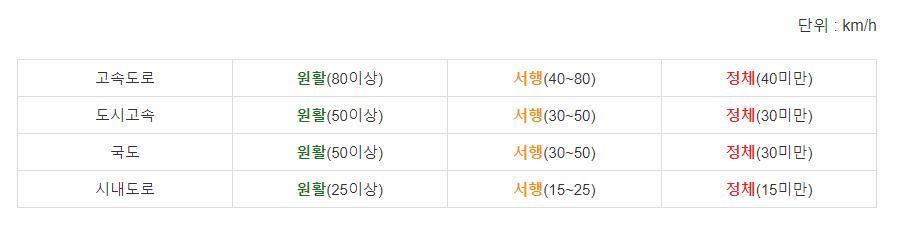 고속도로와 국도 그 외 각각 도로마다 속도로 원활, 서행, 정체를 정해두었습니다.