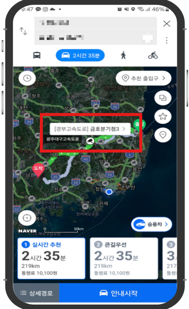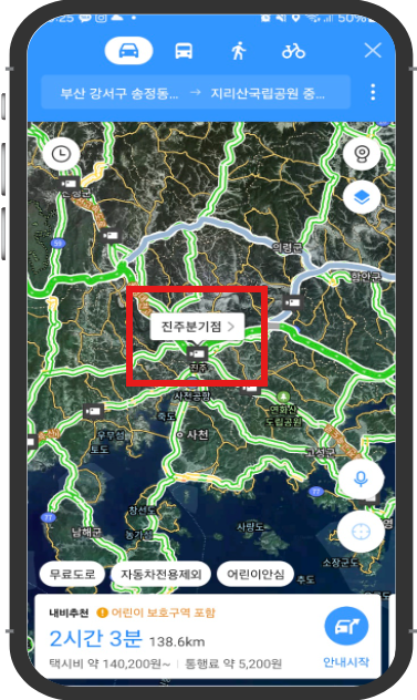 먼저, 경로상 지도를 보시면 3가지의 색으로 교통상황을 표시하고 있습니다.