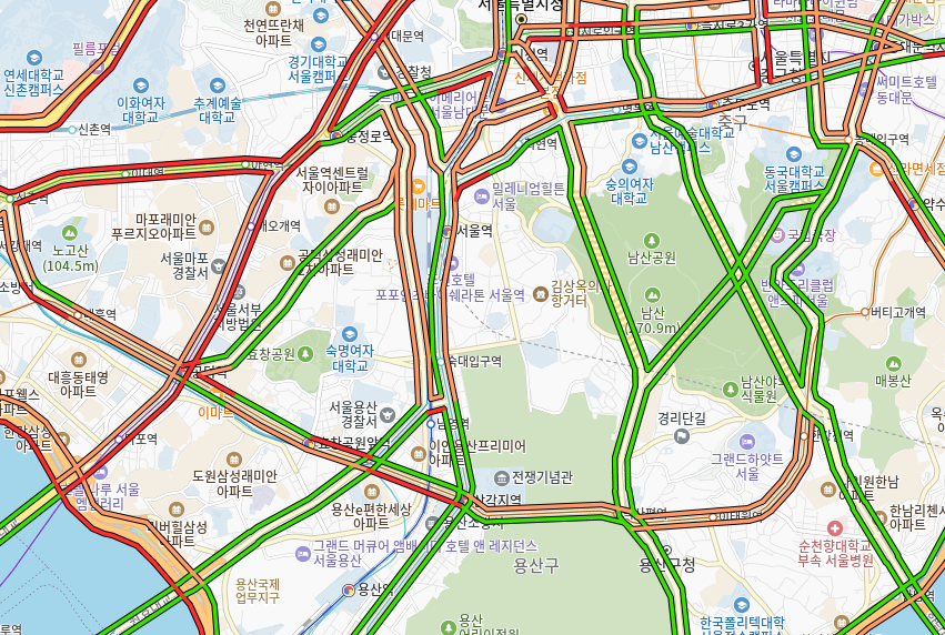 지도상에는 모든 도로가 같이 나타나기 때문에 아래 표를 참고하시면서 교통상황을 확인하시는 것도 좋을 것 같습니다.