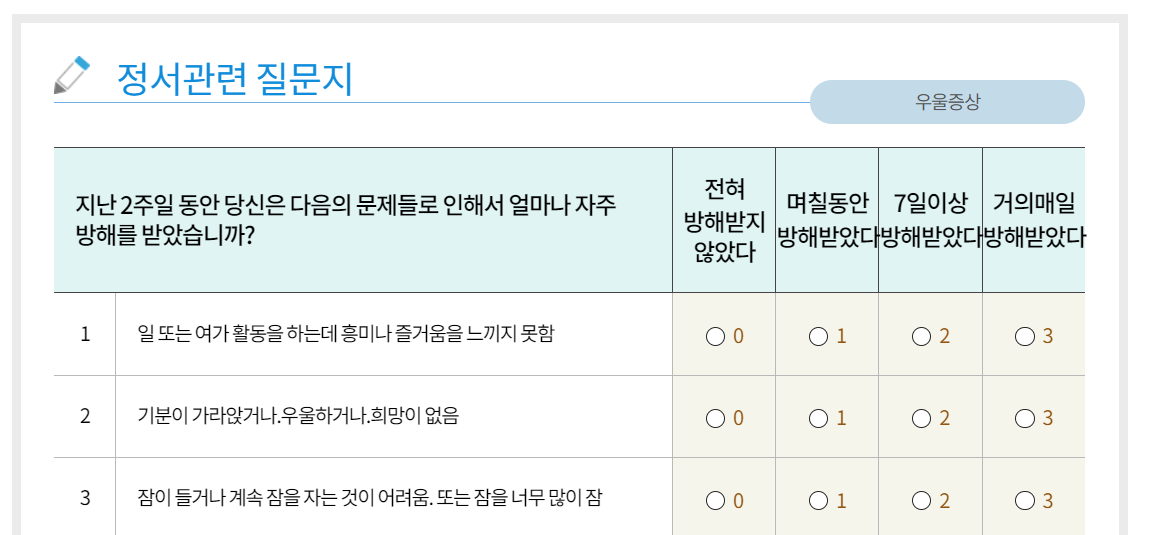 우울증 외에도 불안증상, 신체증상 등등 여러 증상에 대해서도 자가진단이 가능합니다.
