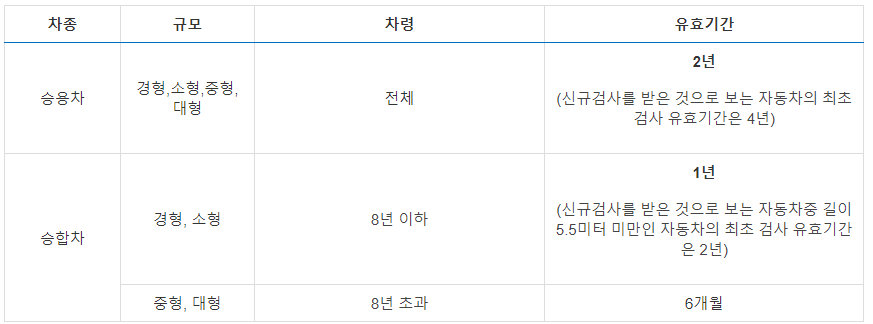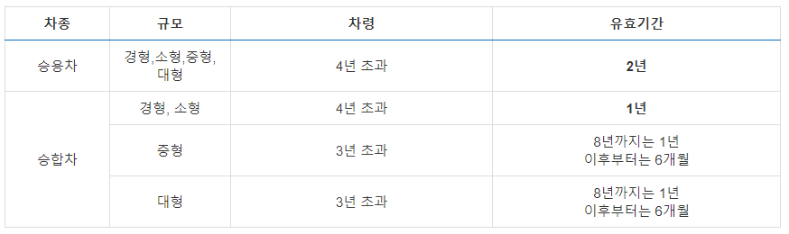 ✔ 승합차(카니발, 스타리아 등 중형승합차)는 3년 이후부터 8년 까지는 1년에 한 번, 8년 이후부터는 6개월에 한 번씩 받으시면 됩니다.