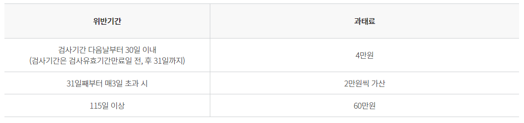 자동차 정기검사 및 종합검사를 검사유효기간 내에 받지 아니할 경우에는 60만 원 이하의 과태료 처분을 받게 됩니다.