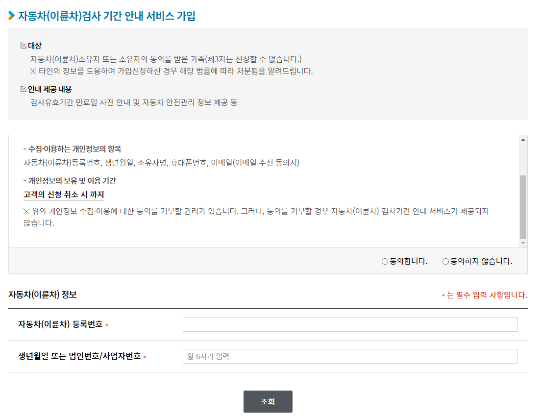 홈페이지를 통해 이름, 생년월일, 휴대폰번호, 자동차등록번호, 소유인을 입력하면 알림 신청이 가능합니다.