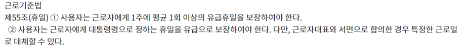 주휴수당은 근로기준법 제55조에 명시되어 있습니다.