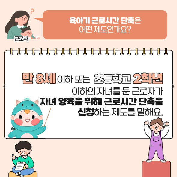 육아기 근로시간 단축제도는 육아의 부담을 줄이며 자녀를 양육하기 위하여 근로시간 단축을 신청할 수 있는 제도입니다.