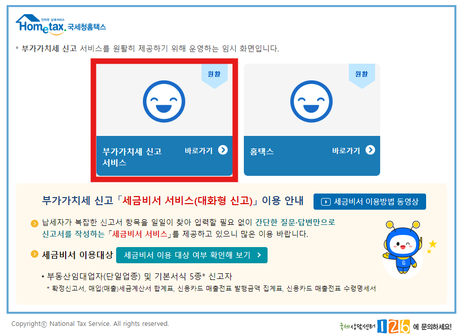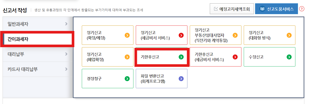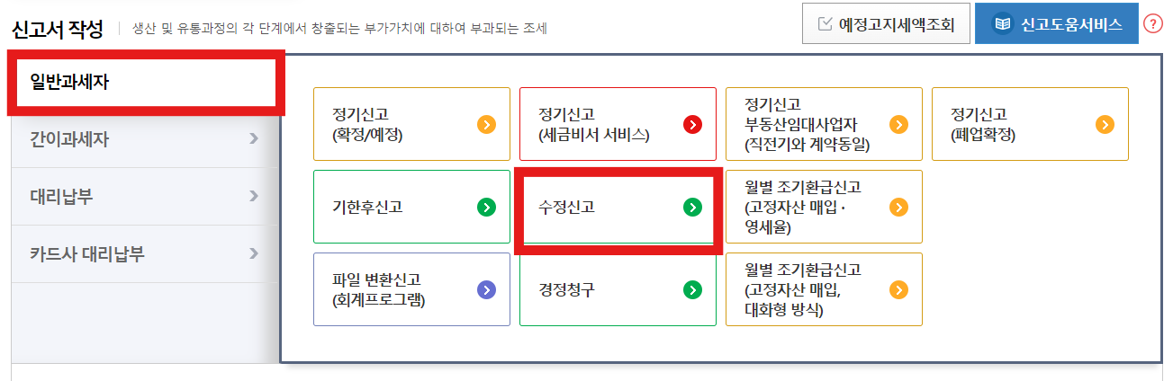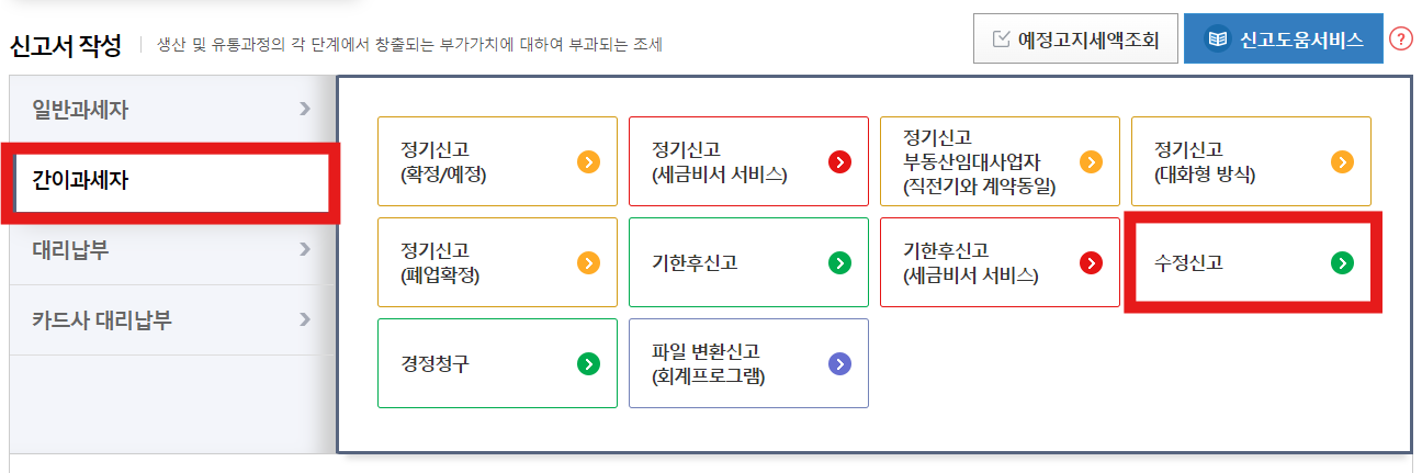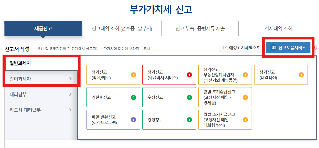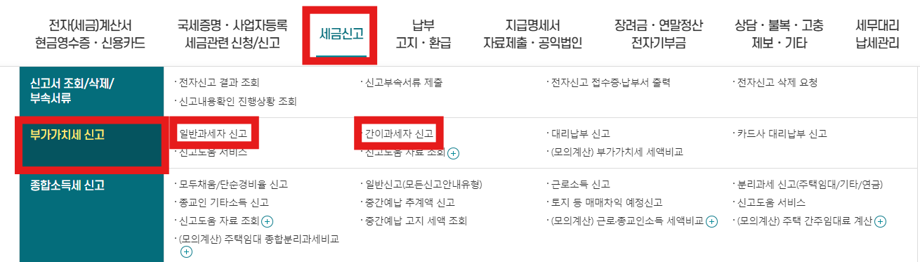 2. 부가세 신고 : 세금신고 -> 부가가치세 신고 -> 일반과세자 or 간이과세자 신고
