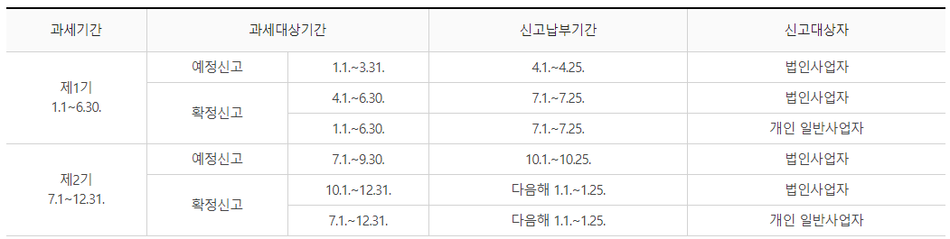 * 부가세는 6개월을 기준으로 제1기와 제2기로 과세기간을 나눕니다. 그다음에 과세기간을 3개월로 또 나누어 중간에 예정신고 기간을 두고 있습니다.