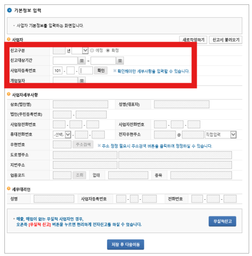 - 만약 실적이 없는 사업자라면 ' 무실적 신고' 버튼을 클릭하시면 됩니다.