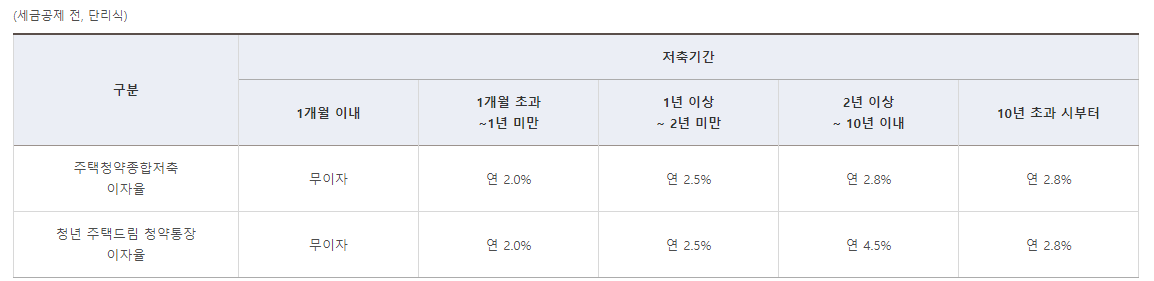납입원금 5,000만 원 한도 내에서 신규가입일로부터 2년 이상인 경우 가입일로부터 10년 이내에서 무주택인 기간에 한하여 기존 '주택청약종합저축'이율에 우대이율(1.7% p)을 더한 이율을 적용.