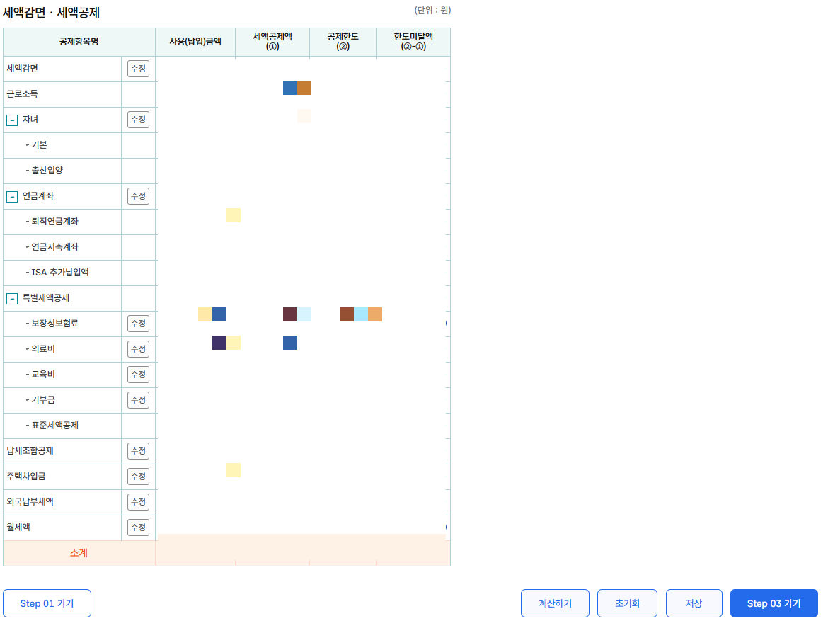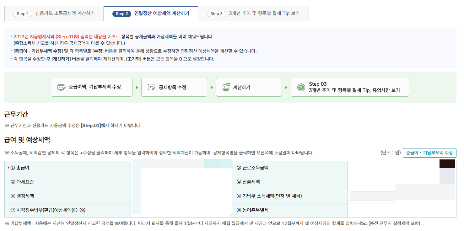 Step1, Step2에 작성하신 정보를 토대로 급여 및 예상세액, 소득공제, 세액감면·세액공제등을 확인하실 수 있습니다.