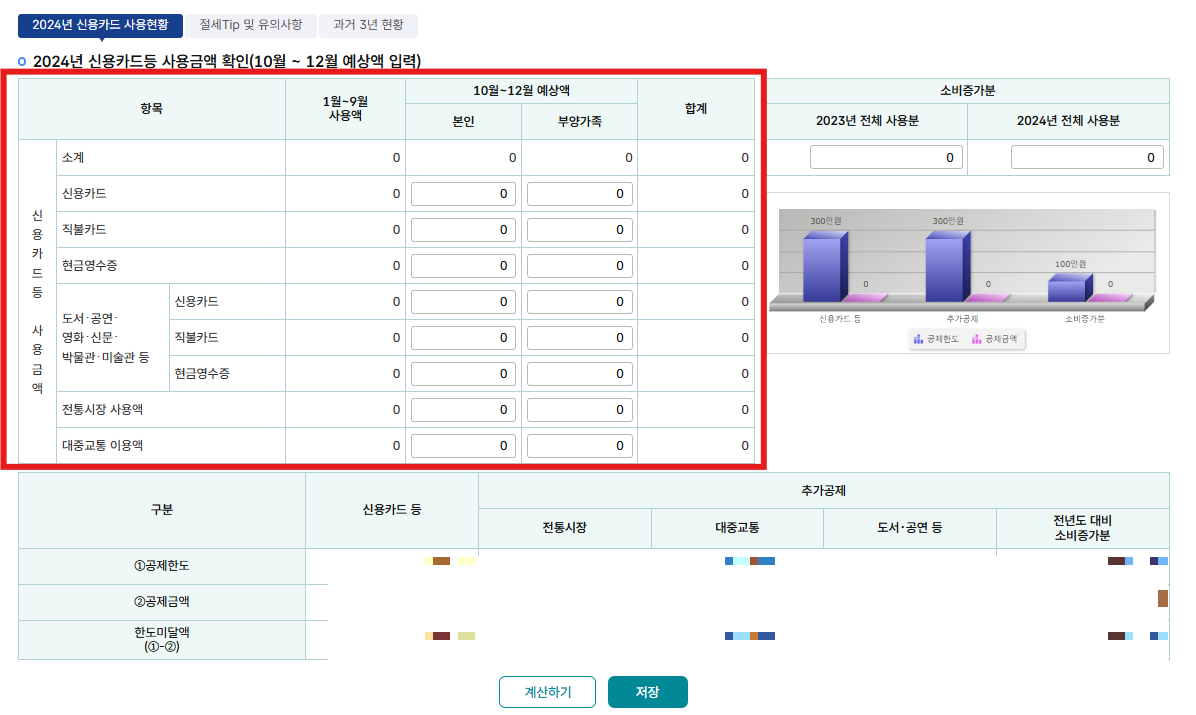 ✔ 2024년 사용 예상액을 해당되는 란에 작성하며 계산하기 또는 저장을 클릭합니다. 해당칸에 작성한 금액으로 예상세액이 측정되므로 빠짐없이 작성하면 됩니다.