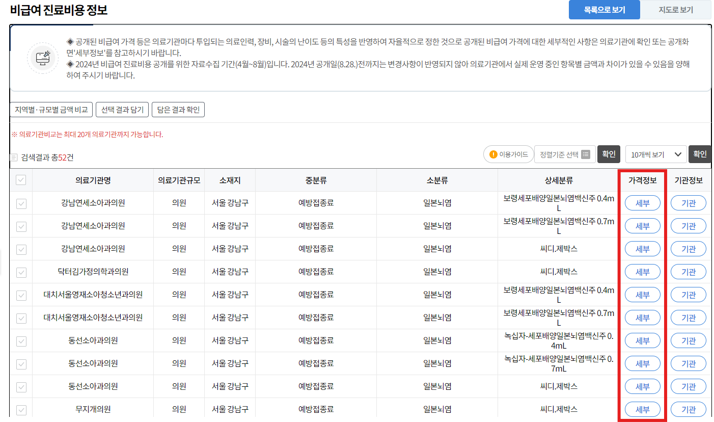 해당 지역과 비급여진료비항목에 알고 싶은 예방접종명을 검색하시면 병원과 세부정보가 나옵니다.