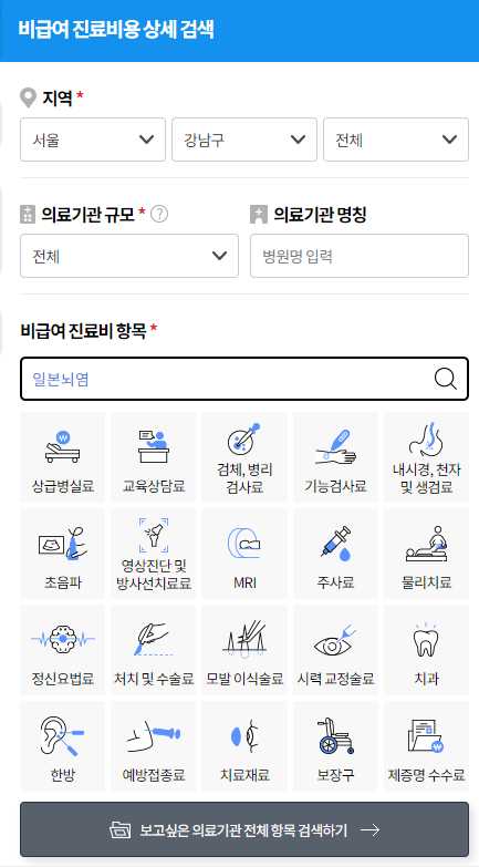 메인화면에 비급여 진료비정보에 들어가서 비급여 진료비용 정보를 클릭하시면 상세 검색란이 나옵니다.