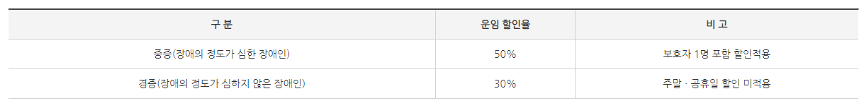 장애인할인 ( 30~50% 운임 할인) : 장애인복지법 및 동법 시행령에 정한 장애인에게 운임 할인적용