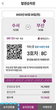 SR홈페이지나 SRT앱에서 발행받은 승차권의 운임 · 요금 환불은 승차권은 승차권에 기재된 출발역 출발 전까지 홈페이지와 앱에서 직접 환불하실 수 있습니다.