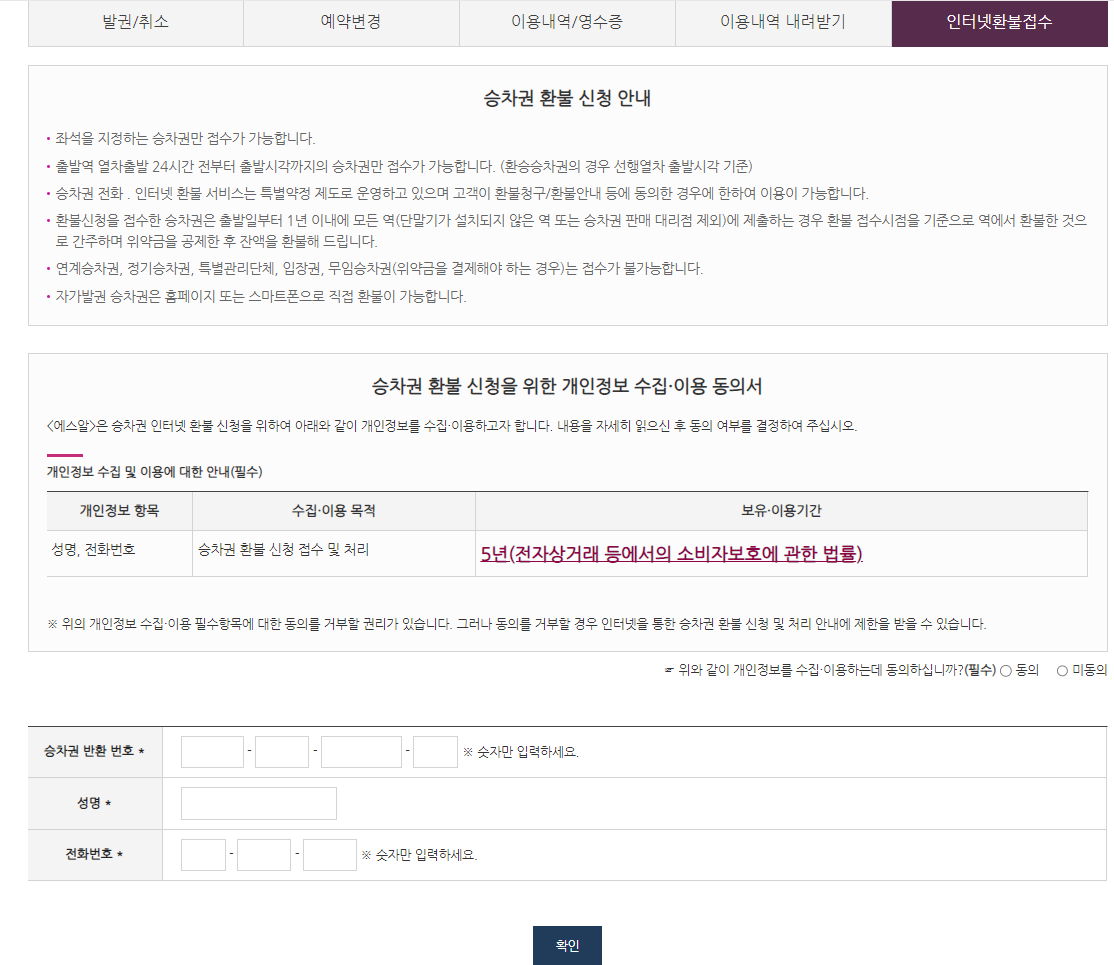 승차권 환불 접수 서비스는 특별약정 제도로 운영하며, 이에 동의한 경우에 한하여 접수 가능합니다.