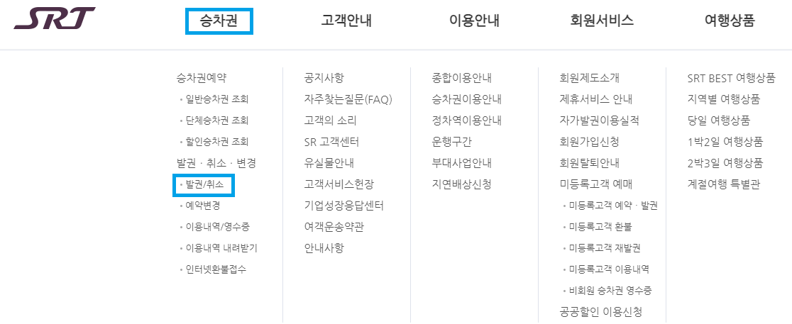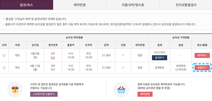 SR홈페이지에서 발행받은 승차권은 홈페이지에서 '승차권 -> 발권/취소' 로 들어가셔서 예약취소/환불하기 가능합니다.