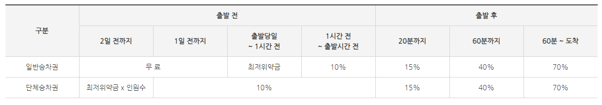 구입한 승차권을 환불하는 경우 환불시점에 따른 위약금이 발생합니다.